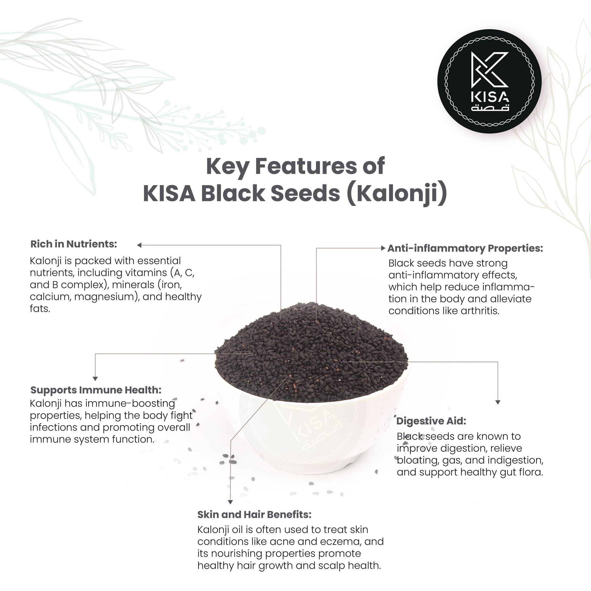 الحبة السوداء، والمعروفة أيضًا باسم حبة البركة أو الكمون الأسود، العربية: حبة البركة (حبات البركة) / الهندية: कलौंjuी (كالونجي) المالايالامية: കള്ളോഞ്ചി (كالونجي) / التاميل: நிகெல்லா சாட்டிவா (حبة البركة) أو களாஞ்சி (كالانجى) / الكانادا: ನಿಗೆಲ್ಲಾ ಸಟಿವಾ (حبة البركة كالونجي (كالونجي) أو كالونجي (كالونجي) هي بذور صغيرة سوداء اللون تحظى باحترام كبير بسبب نكهتها القوية وفوائدها الصحية العديدة. وقد استخدمت هذه البذور لقرون في الطب التقليدي والممارسات الطهوية في جميع أنحاء الشرق الأوسط والهند. ، وأفريقيا. تتمتع البذور السوداء بطعم مرير قليلاً وحار، وغالبًا ما تُستخدم لتعزيز الأطباق مثل الكاري والخبز والمخللات. بالإضافة إلى قيمتها الطهوية، تشتهر البذور السوداء بخصائصها الطبية. فهي غنية بمضادات الأكسدة والأحماض الدهنية الأساسية والفيتامينات، ويُعتقد أنها تدعم صحة المناعة وتحسن الهضم وتعزز صحة الجلد. كما تُعرف البذور السوداء بتأثيراتها المضادة للالتهابات ومضادات الميكروبات والفطريات، مما يجعلها علاجًا طبيعيًا شائعًا في الصحة الشاملة سواء تم استخدامها في الطعام أو كمكمل غذائي، توفر البذور السوداء مزيجًا قويًا من النكهة والفوائد الصحية.