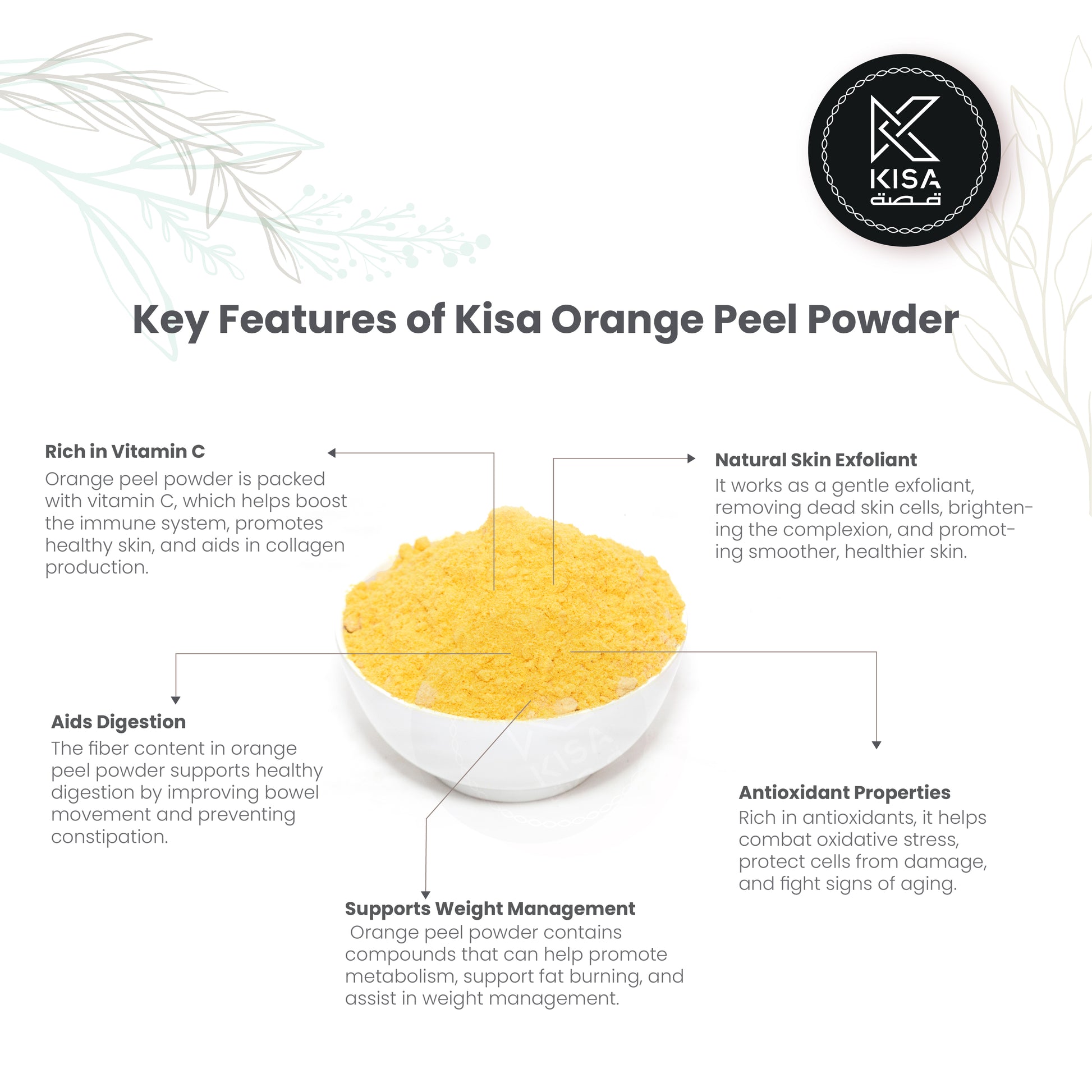 KISA Orange Peel Powder is a natural powerhouse for radiant skin. Packed with vitamin C and antioxidants, it helps brighten your complexion, control excess oil, and gently exfoliate for a smooth, glowing look. Its antibacterial properties make it ideal for acne-prone skin, while its refreshing citrus aroma revitalizes your senses. Mix with water, yogurt, or honey for a rejuvenating face mask and experience nature’s glow!