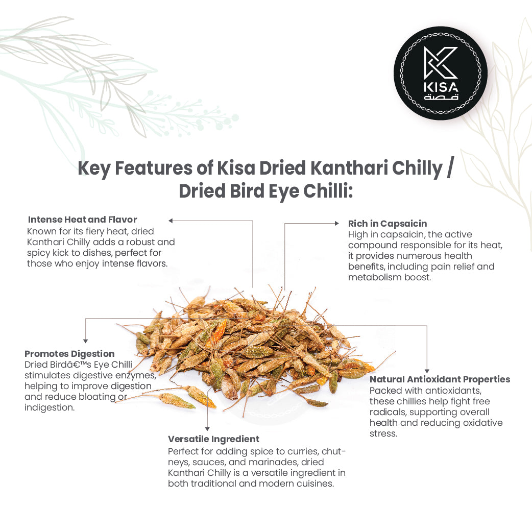 Birds Eye Chilli, commonly known as Kandari Chilli, is a small but potent chili variety renowned for its intense heat and distinct flavor. Native to Southeast Asia and popular in various cuisines, Kandari Chilli is often used in spicy dishes, sauces, and marinades. These tiny red or green chilies pack a powerful punch, making them a favorite among spice lovers. Beyond their culinary uses, Birds Eye Chilli is rich in vitamins A and C and contains capsaicin, known for its anti-inflammatory and metabolism-boosting properties. Whether used fresh, dried, or in powdered form, Kandari Chilli adds a fiery kick and depth of flavor to a wide range of dishes.