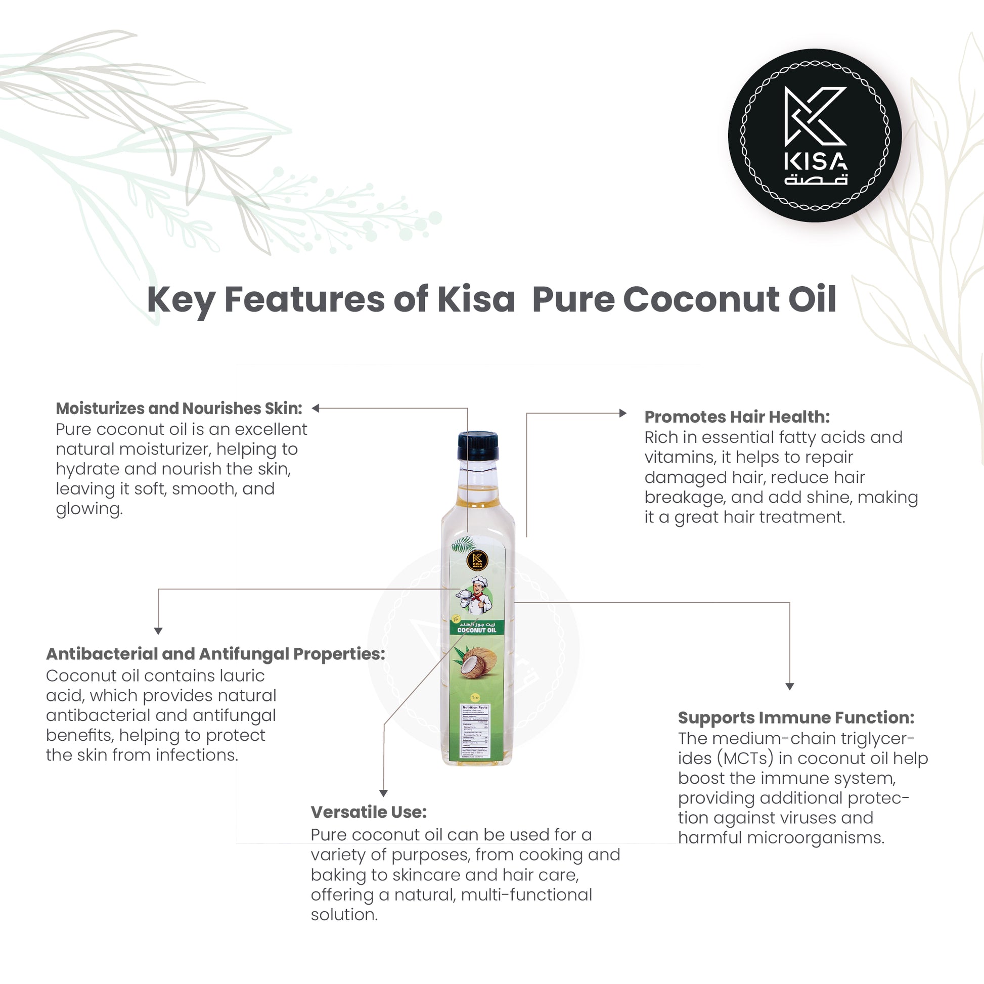 Pure coconut oil is a natural oil extracted from the flesh of fresh coconuts, celebrated for its versatility and health benefits. It is rich in medium-chain fatty acids, particularly lauric acid, which can support heart health and boost metabolism. Pure coconut oil is commonly used in cooking and baking due to its light flavor and high smoke point, making it ideal for frying and sautéing. Additionally, it is popular in skincare and haircare, known for its moisturizing properties and ability to nourish dry skin and hair. With its array of uses, pure coconut oil is a staple in both culinary and beauty applications.