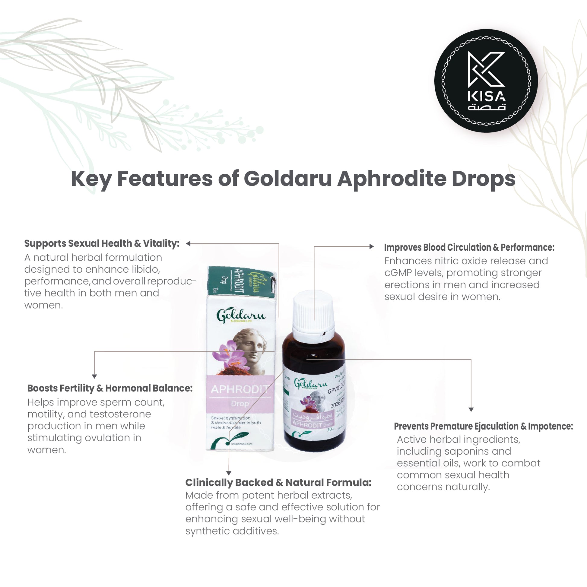 Goldaru Aphrodite Drops are a natural herbal formulation designed to support sexual health and vitality in both men and women. By enhancing nitric oxide release and increasing cGMP levels, the drops improve blood circulation, promoting stronger and longer-lasting erections in men while boosting sexual desire in women. The product’s active herbal ingredients, including saponins and essential oils, help eliminate impotence, prevent premature ejaculation, and ensure a more satisfying sexual experience. Clinical studies have shown that saponins found in the formulation increase sperm count, motility, and survival time, making it beneficial for men dealing with infertility issues. Additionally, the drops stimulate the production of testosterone by increasing LH hormone levels, supporting overall reproductive health. In women, the formulation enhances libido and stimulates ovulation, offering comprehensive support for improved sexual well-being.