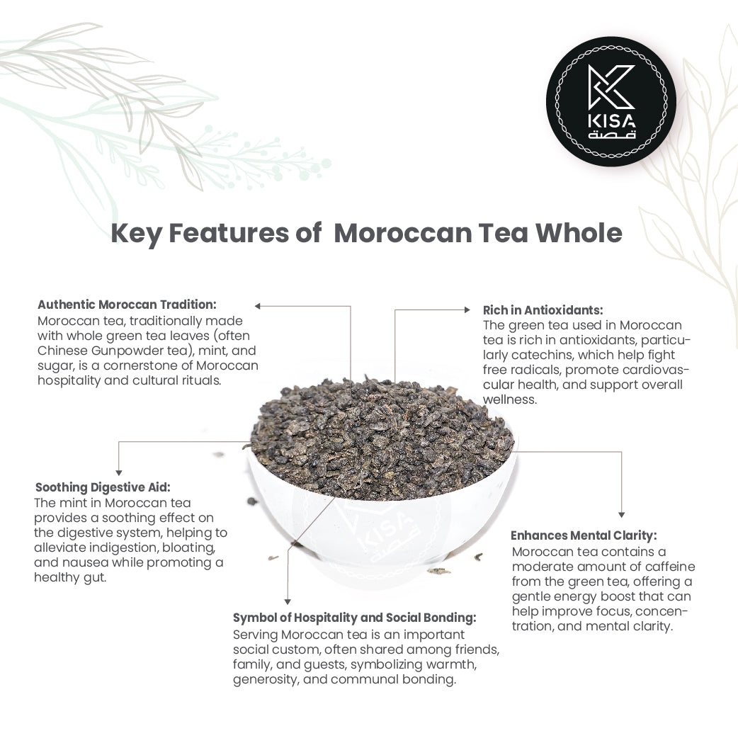 Moroccan tea leaves,• شاي مغربي (Shay Maghribi) available in both whole and split forms, are essential for crafting the traditional Moroccan mint tea, a fragrant and refreshing beverage. These high-quality green tea leaves are known for their robust flavor and aromatic qualities, making them perfect for brewing with fresh mint and sugar. Whole leaves provide a rich, full-bodied taste, while split leaves infuse more quickly, offering a vibrant, invigorating tea experience. Enjoyed in social settings or as a calming ritual, Moroccan tea embodies warmth and hospitality, making it a beloved staple in Moroccan culture.