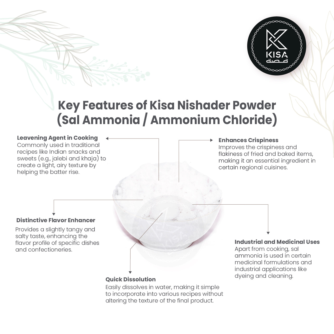 Nishader powder, also known as ammonium chloride powder or sal ammoniac, Navasaram , is a versatile ingredient commonly used in culinary applications. With a distinctive salty and slightly bitter taste, it is often utilized in traditional recipes to enhance flavor and act as a leavening agent in certain breads and pastries. In addition to its culinary uses, Nishader powder can aid in improving the texture of dishes and is sometimes used in pickling and preserving. Its unique properties make it a valuable addition to various cuisines, offering a touch of tradition and depth to your culinary creations.